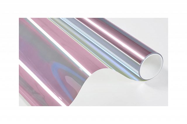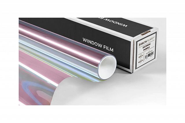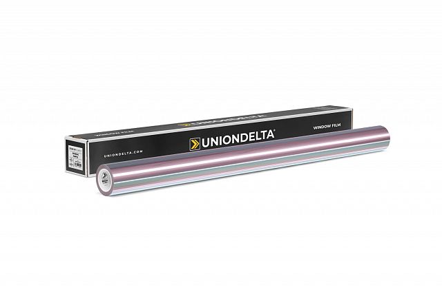 Декоративная дихроичная пленка Uniondelta DICHROIC PURPLE 2 MIL, 1,36*30 м, 60 мкм, хамелеон Высокотехнологичная зеркальная архитектурная плёнка с эффектом хамелеона тёплого жёлто-розового цвета. Оттенок плёнки зависит от интенсивности освещения.