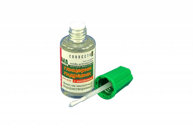 Флюс для пайки Connector, глицерин, гидразин, 180-350 °С, с кисточкой, 20 мл, прозрачный Флюс для пайки "глицерин-гидразин" — один из самых активных флюсов, который допускает пайку печатных плат с некоторыми оговорками.