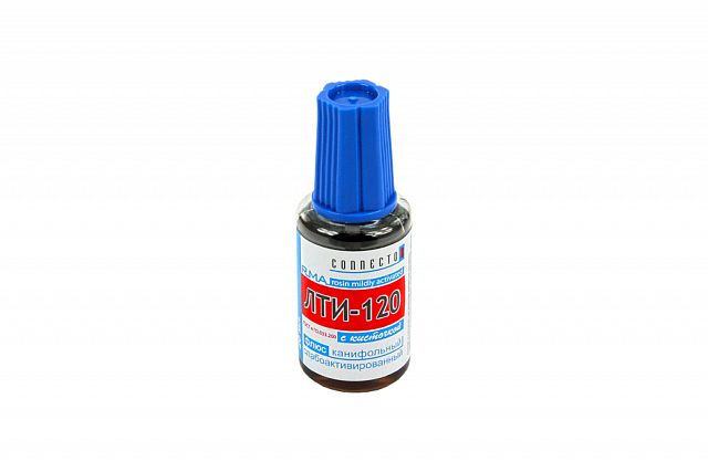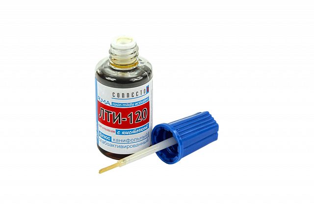 Флюс для пайки ЛТИ-120 Connector, с кисточкой, 180-350 °С, 20 мл, коричневый Флюс для пайки ЛТИ-120 — канифольный активированный флюс для пайки. Пайка печатных плат происходит очень быстро и легко. Мощный паяльник с этим флюсом позволяет спаивать даже оцинкованное железо. ЛТИ-120 часто называют паяльным лаком из-за защитных свойств оставшегося флюса.