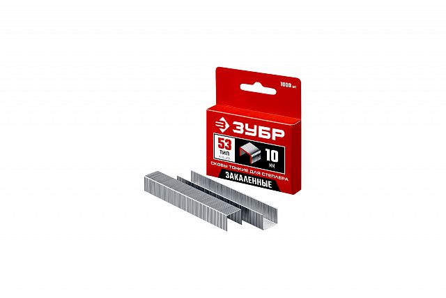 Скобы для степлера, тонкие, закаленные, тип 53 (A/10/JT21) калибр 23GA, 10 мм, Зубр, 1000 шт Прочный расходный материал для строительных степлеров при работе с деревом, ДВП, пластиком и другими материалами.