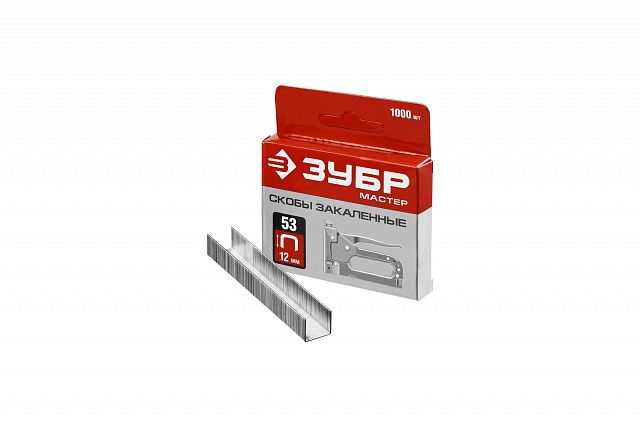 Скобы для степлера, тонкие, закаленные, тип 53 (A/10/JT21) калибр 23GA, 12 мм, Зубр, 1000 шт Прочный расходный материал для строительных степлеров при работе с деревом, ДВП, пластиком и другими материалами.