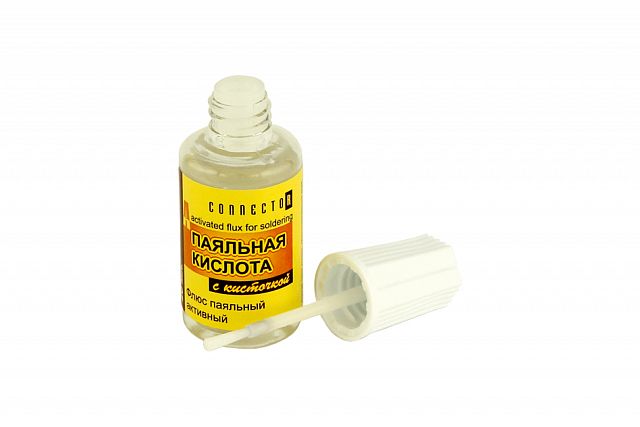 Кислота паяльная Connector, с кисточкой, 180-350 °С, 20 мл, прозрачный Паяльная кислота — это высокоактивный флюс, используемый для пайки углеродистых и низколегированных сталей, меди, никеля и их сплавов. Она обладает отличными флюсующими свойствами.