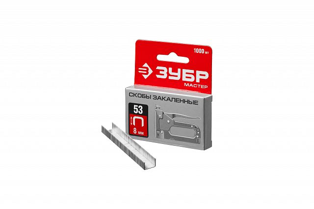 Скобы для степлера, тонкие, закаленные, тип 53 (A/10/JT21) калибр 23GA, 8 мм, Зубр, 1000 шт Прочный расходный материал для строительных степлеров при работе с деревом, ДВП, пластиком и другими материалами.