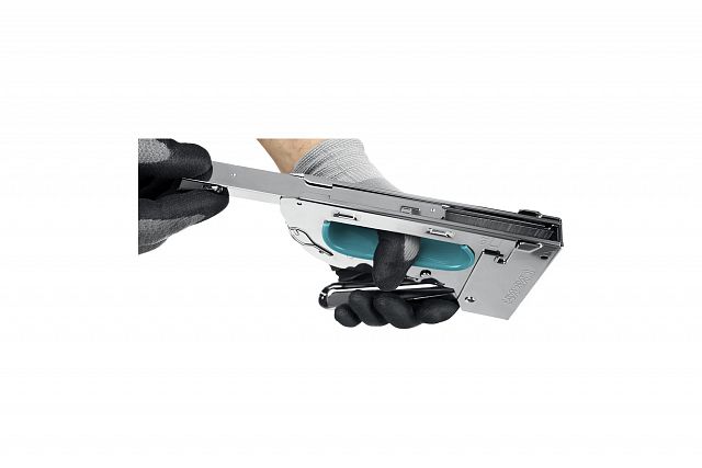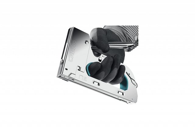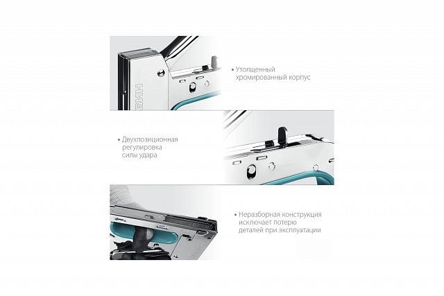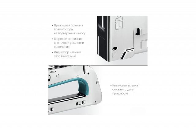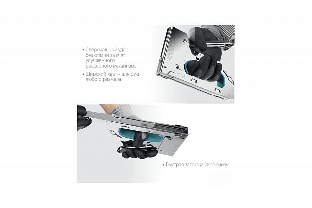Степлер со стальным корпусом, двухступенчатой регулировкой силы удара, бойком из закалённой инструментальной стали и резиновой вставкой для снижения отдачи. Также имеется система фиксации рукоятки и двухступенчатая регулировка силы удара.