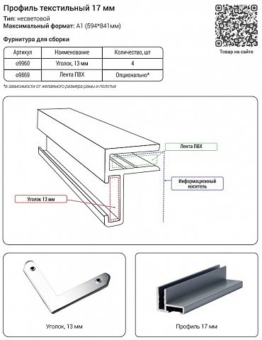 - в рамах со сторонами более 1-2 метров р3450 Пластина для текстильного профиля, соединительная устанавливается внахлест с импостом в пазы для уголка о9960 Уголок для текстильного профиля соединительный, 13 мм