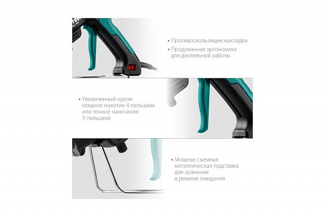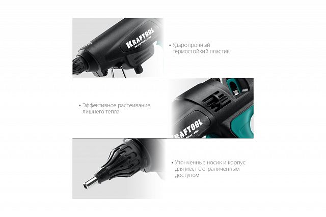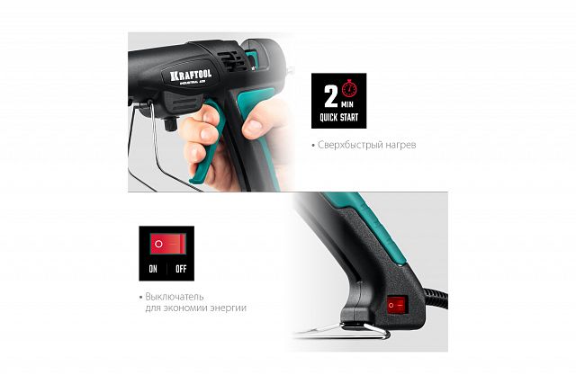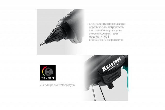 Клеевой пистолет электрический KRAFTOOL Industrial 400, 300 Вт, 130-230°С, D 11-12 мм, 50 г/мин Сверхмощный клеевой пистолет с регулятором температуры для разных типов клея.