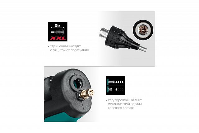 - Есть винт для регулировки механического нанесения клея и возможность замены насадок.